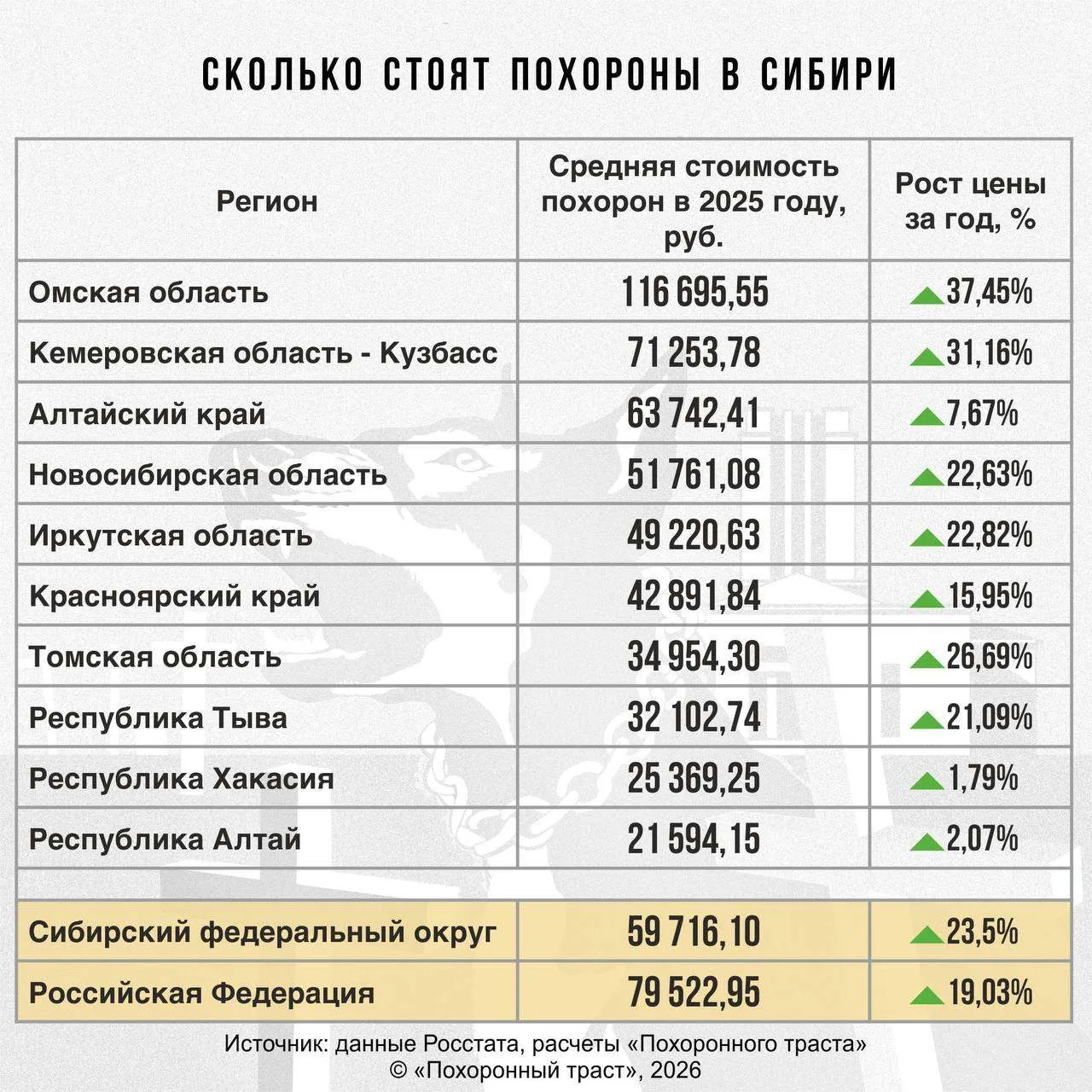 Среднюю стоимость ритуальных услуг по сибирским регионам подсчитал telegram-канал «Похоронный траст». Аналитики со ссылкой на данные Росстата сообщают, что в целом по России стоимость похорон за 2025 год выросла на 19%. В Сибири – на 23,5%.