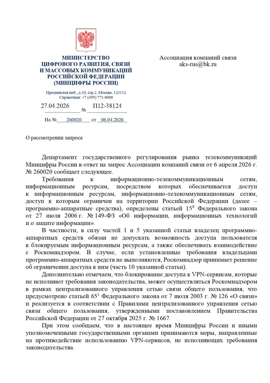 Ответ Минцифры на запрос Ассоциации компаний связи опубликовал канал «Обратная сторона телекома». Из документа следует, что в ведомстве прорабатывают отдельную тарификацию международного трафика. Это касается пока только мобильных телефонов. При этом использование VPN приравнивается к международному трафику.