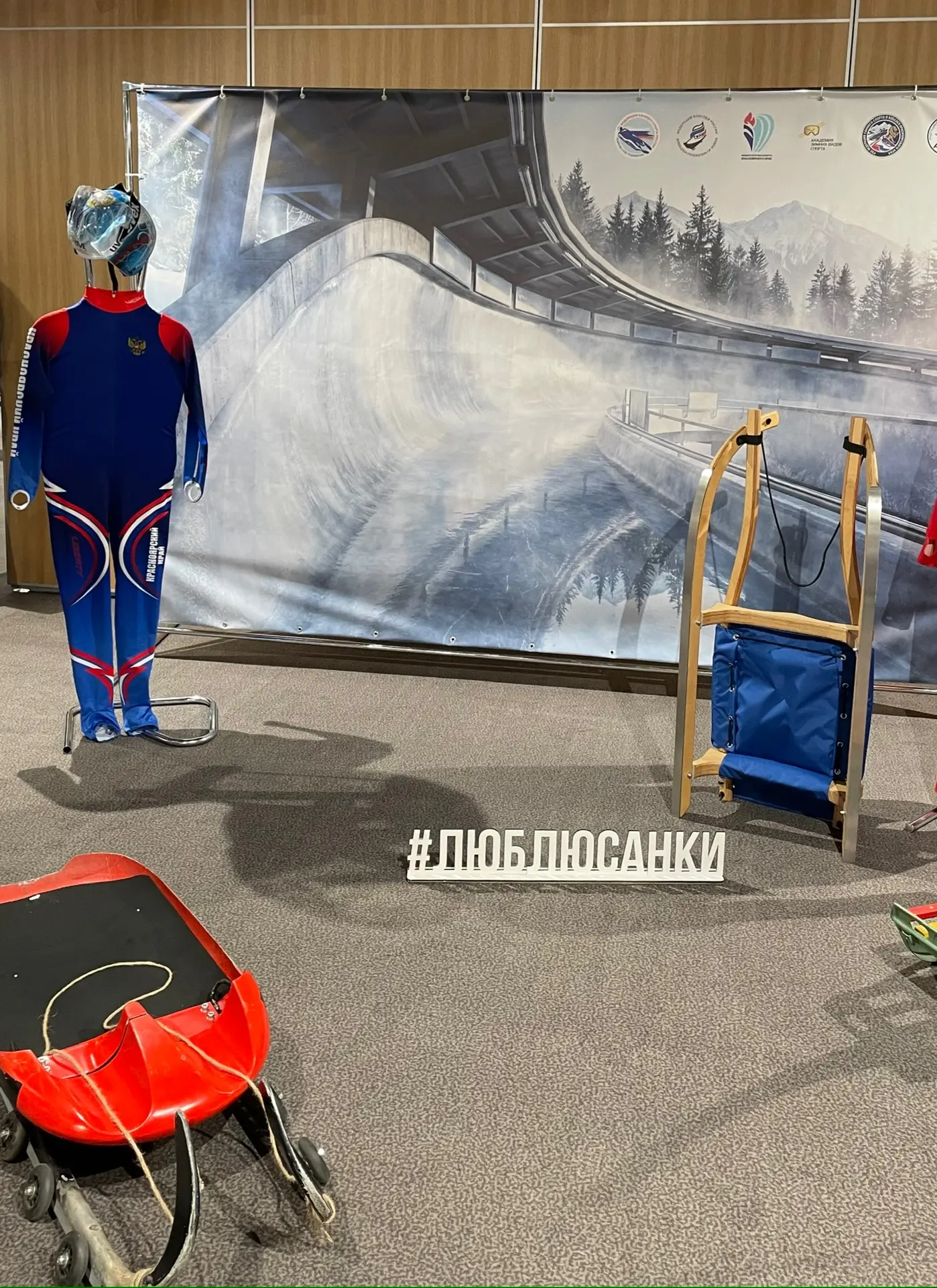 Школа по санным видам спорта подготовила фотолокацию с санями и экипировкой – как 70-х годов, так и современные варианты. Желающие могли сделать фото в зимних, летних или горных санях на фоне виража.